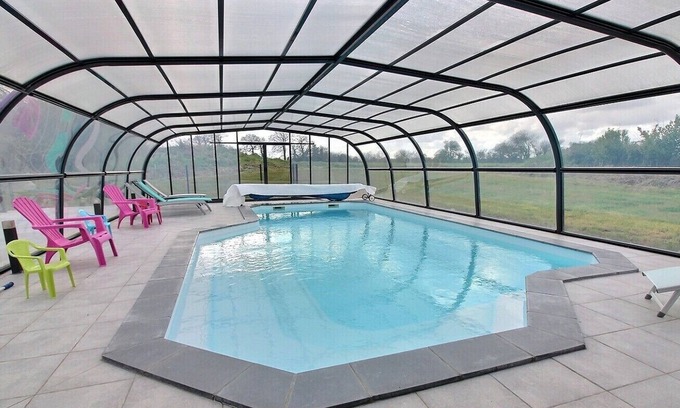 Your vacation rental includes on the ground floor: living room with kitchen area and lounge area (43 m²) with fireplace, 1 bedroom (1 double bed), bathroom with shower, WC. Floor: 3 bedrooms (1 double bed, 4 single beds), bathroom with bathtub, WC. Radio-cassette CD. Shared tumble dryer. Courtyard 100 m² and lawn 1000 m². Large south-facing terrace. Indoor swimming pool heated to 28° maximum depth 1.40m common to 4 gîtes: 9.5m x 4.9m open all year. This spacious and bright gîte, in a group of 3 gîtes, has an independent entrance, 200 m from the owners' farm who can show you the sheep farm and the mini-farm with Chinese pigs, dwarf goats, a donkey and horses. 1.5 km from the town, 4 km from the beaches (pebble and sand) and 15 km from Trestel, fine sand beach. Come and relax away from all the hustle and bustle.