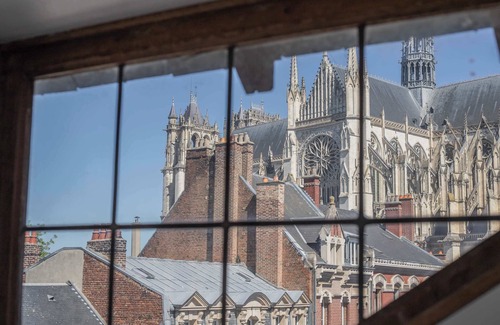 Located right in the city center, the apartment offers a spectacular view of Amiens Cathedral, visible directly from the window.