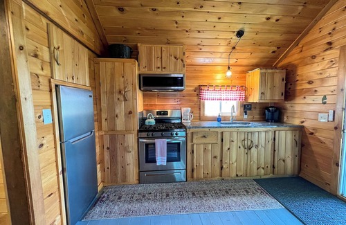 Two cozy bedrooms provide ample space for up to 5 guests, making this an ideal spot for, couples, families, and friends. The primary bedroom features a queen bed. In the “Bunk Room” you will find a full size bed and twin bed. The living area boasts of a brand new comfy couch, solid wood dining table, and views of the lake. The well appointed kitchen gives you the tools you need to whip up a delicious meal.