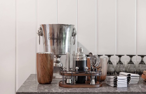 The kitchen has a SMEG fridge-freezer and retro style appliances. There is a locally hand-made live edge bar table with seating for an enjoyable breakfast. There is a fully stocked coffee and tea bar for all your caffeine needs.