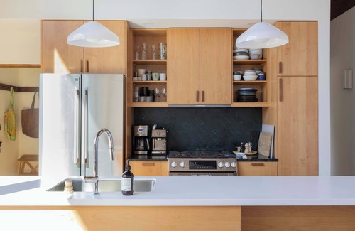This bright and airy room beautifully blends modern design with warm, natural elements and features light wood flooring and matching wooden furniture that complements the wood-paneled ceiling. The kitchen and dining area are sleek and functional with a central island, bar seating and a dining table.