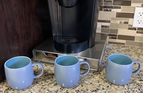 The kitchen has modern granite finishes and is fully stocked including microwave, coffee machine (keurig + k-cups), toaster, blender, kettle, pots, pans, air fryer, cookware, glassware, dinnerware, cutlery, prep bowls, measuring cups.