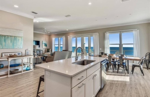 Legasea is a beachfront beauty with amazing views. Custom built by Gary Ulrich and decorated by the owners, this home features a contemporary, relaxed feel. Decorated in the colors of sand and sea, the open living area on the first floor features rustic textures and modern hues that blend perfectly. Covered porches invite you to enjoy panoramic views of the Gulf. Quartz counters in the open kitchen are a perfect complement to the glass tile backsplash and highlight the home?s clean lines. The large dining table seats 12 with additional seating at the kitchen island. The main living area boasts a large smart TV, comfortable seating, a lovely powder room and gorgeous views of the beach and Gulf. All 5 bedrooms have en suite bathrooms, smart TV's and are decorated in hues of muted grey and white furthering the serenity. There are 3 king suites, 1 queen suite and a bunk room suite that sleeps 4. A morning kitchen on the upper floor is equipped with a coffee maker and small refrigerator. The private pool with spacious deck and under house entertaining area make for wonderful memories. A fabulous dune overwalk, an enclosed outdoor shower, a park style grill and ample parking complete the ground level. This home highlights the simplicity and splendor of coastal living.