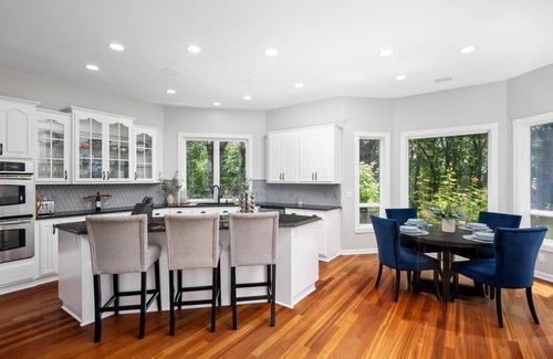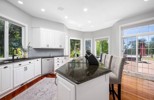 The custom-built main home is rich in high-end finishes and elegant design. Soaring vaulted ceilings and walls of windows bathe the living and kitchen areas in natural light, showcasing the stunning surrounding landscape. The gourmet kitchen flows into a cozy eat-in nook and an adjacent formal dining room, offering flexible options for any gathering. Every detail—inside and out—has been thoughtfully curated with top-tier furnishings and décor, creating a perfect blend of comfort and refined style.