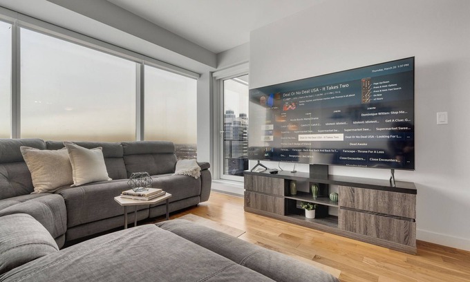 Beside the kitchen you will find your comfortable living room with a huge sectional TV, gigantic HD TV and panoramic city views out the large windows and off the adjacent outdoor balcony.