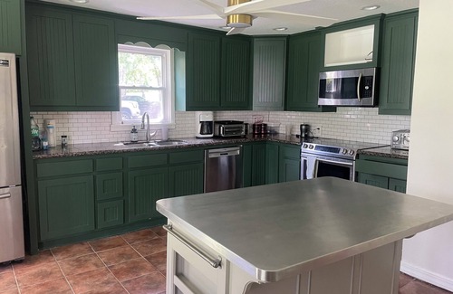 The kitchen is stocked with all cooking needs along with a small Green Egg for outdoor grilling. All bedrooms are upstairs with one full shower. Bottom floor has full bath, laundry room, kitchen, living room and a large dining room with a built in small bar great for game nights or entertainment.