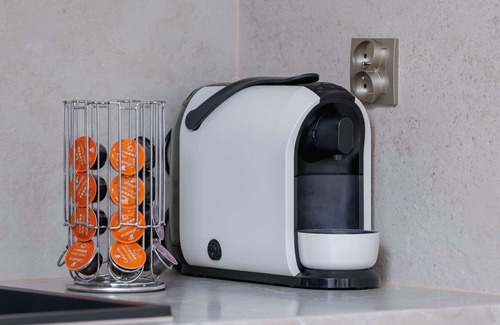 Electric hob, fridge with freezer, electric kettle, set of dishes, dishwasher, frying pan, microwave, oven, coffee maker