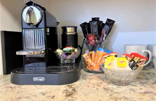 Breakfast is made easy with two toasters an electric jug and Delonghi Nespresso Citiz Coffee pod machine.