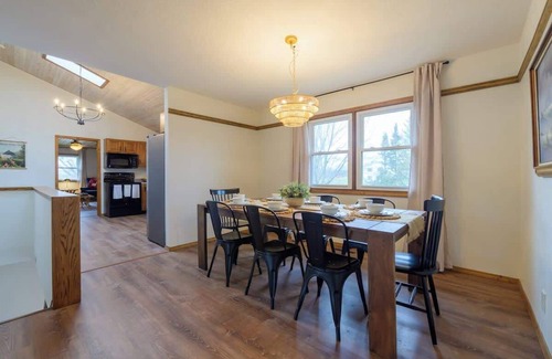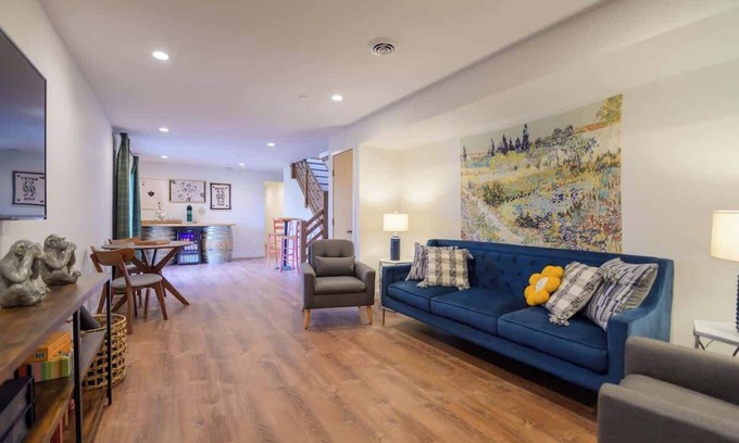 As you enter the home you are welcomed into a spacious living room with large sectional, small seating area, & huge smart TV with streaming capabilities. Through the vintage french doors is the dining room with seating for 8. The kitchen features updated appliances with dishwasher & coffee bar stocked with regular ground coffee, sugar, creamers, & an assortment of flavored syrups. Our favorite room is the den which we call our ‘music room’. Anchored by a wood burning fireplace, this room features our vintage family piano, a record player, & an assortment of records for your listening pleasure. Through the den guests can access the enclosed deck space, perfect for lounging or late summer nights. We have an extensive outdoor deck space that can’t be missed! The main level features 3 bedrooms; a Primary bedroom with ensuite bathroom with walk in shower (King Bed), second bedroom (King Bed), a bunk room (2 Bunk Beds, 4 twins), & a hall bath with shower/bathtub. The lower level features a large recreation space with smart TV, ample seating areas, bar area with beverage refrigerator & Keurig single serve coffee maker. The lower level features a fourth bedroom with 2 twin beds & a half bath. Through the bar area you can access our massive backyard. We also have a grill for your use. Enjoy your stay!