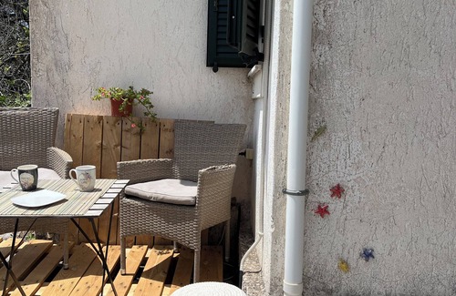 Extremely silent. The house's isolation, rustic charm, and peaceful surroundings are its best features. sweeping views between the olive trees. It is on the outskirts of the tiny Agios Markos village, where the locals live in just two nearby houses. Nestled in the Mediterranean essences of his garden (fig and lemon trees, grapes, mint, laurel, and rosemary), which is shared with the main house, this completely refurbished property stays true to the Corfiot style.