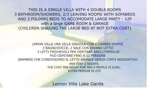 Providing a garden, Lemon Villa Lake Garda features accommodations in Cavalcaselle. This beachfront property offers access to a balcony, a pool table, free private parking, and free Wifi. On clear days, guests can head outside to enjoy the villa's outdoor fireplace. The villa consists of 4 bedrooms, 3 living rooms, a fully equipped kitchen with a dishwasher and a coffee machine, and 3 bathrooms with a bidet and a hair dryer. Guests can take in the ambience of the surroundings from an outdoor dining area or keep warm by the fireplace on colder days. The villa offers bed linen, towels, and laundry service. For guests with children, the villa provides kids pool, an indoor play area, and outdoor play equipment. Guests at Lemon Villa Lake Garda can enjoy skiing and snorkeling nearby, or make the most of the sun terrace. Gardaland is 3.1 miles from the accommodation, while Terme Sirmione - Virgilio is 8.5 miles from the property. Verona Airport is 12 miles away, and the property offers a paid airport shuttle service.