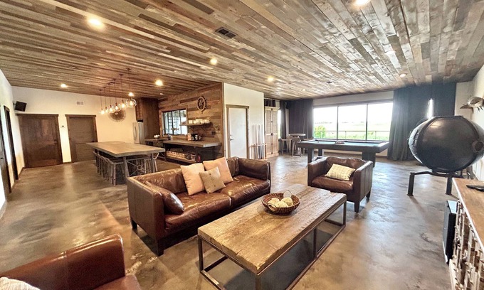 Travertine showers, concrete floors, solid wood timber throughout and petrified wood sinks; the rustic, modern style of Lemonfish Lodge was thoughtfully designed. Have a good time around the 16ft kitchen island or play a round of pool on the regulation size pool table!