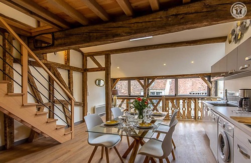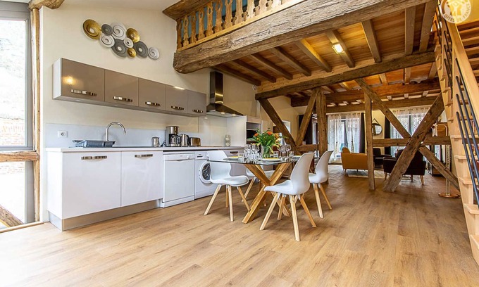 Passionate ambassador of the city that she will help you discover by orienting and guiding you as best as possible, Maryse welcomes you to an authentic 17th century residence steeped in history, restored according to the rules of the art in its interior, fully air-conditioned, nestled in peace in the heart of the medieval city, in the hollow of a backyard of approximately 30 m2 without any opposite. Prime location - ultra privileged - on the famous Rue aux 157 arcades, iconic shopping street surrounded by picturesque facades preserved from the 14th to the 16th century. Nestled on the banks of the Seille (waterway with a small marina on site) on a natural site protected for its ecosystem, famous for its very famous "Monday market" labeled "Remarkable site of taste" (one of the largest retail poultry markets in France), the capital of Bresse has a rich heritage to discover (remains of ancient ramparts, numerous remarkable medieval buildings including several towers & private mansions, 14th century church, 17th century Hôtel Dieux , rare old regime town hall…). Spacious, very comfortable gîte. Large living room enhanced by an elegant heritage restoration (sculptural half-timbered pieces & beautiful original fireplace), opening onto the village via a large panoramic bay. Warm, opulent character mixing tradition & modernity, bourgeois atmosphere and contemporary Scandinavian influences. Lots of style and character. Ultra cozy and cocooning. Composition: Terraced house (total independence). Electric heating. Wireless. Access to the ground floor (hall). 1st floor : living room-kitchen-lounge. 2nd floor : 2 bedrooms (2 single beds 90x200cm which can be combined into a double bed 180x200cm in each) with private bathroom (showers / + toilet in one), separate toilet. Private terrace (enclosed courtyard). Private garage 200 m away including 100 m of covered passage: €40 per week. All amenities on site and train station.