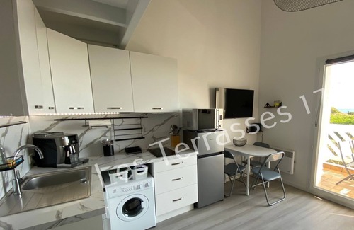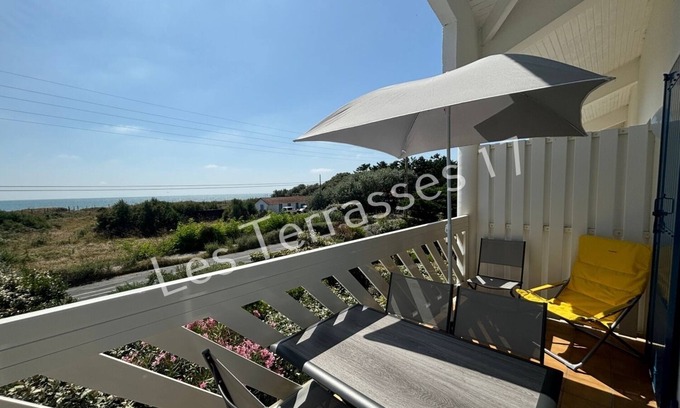 In Saint Pierre d'Oléron, La Cotinière, facing the ocean, our refurbished apartments for 2 to 5 people each, with a living room including a fitted kitchen and a lounge with sofa bed, TV and free WiFi, a balcony with ocean view, 1 bedroom and a mezzanine, shower room and separate toilet, a private parking space in the residence.