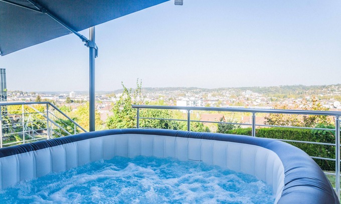 Take a relaxing break in this brand new 25 m2 studio, calm and elegant, fully equipped with its 16 m2 terrace set in a tree-lined environment. You will enjoy the exceptional situation of a private jacuzzi accessible all year round.Located 15 minutes walk from the city centre of Brive in Corrèze, on the road to Turenne and Collonges la Rouge (15 minutes). Numerous relaxation and swimming spots in the heart of lush nature.You will also discover the Lot Valley.The accommodationThe studio includes:- A room open to two people with a 140x200 Simmons bed- A two-person sofa bed 140x200 with a mattress 20 cm thick. Sheets are provided.- Large wardrobe with plenty of storage.- Kitchen equipped with a double vitro-ceramic hob, a hood, a washing machine, microwave, coffee maker, toaster and a kettle.We provide you with essential products upon arrival (coffee, tea, pasta, oil, sugar etc...)Possibility to order at the time of booking a charcuterie and cheese plancha, small bottle of champagne (40 euros for 2 people).- 32-inch TV with Amazon Firestick TV including Amazon Prime Video, Canal+ Series, Disney+, Molotov TV to access all TV channels.- Bathroom equipped with a toilet, a level shower with sliding door, a washbasin unit with storage, an electric towel rail.Toilet linen is provided.- Balcony fitted out on garden with panoramic view over Brive- Private terrace of 16 m2 with table, chairs and sunbed.- Jacuzzi for 6 people with massage jets, max 1 hour/day, no use after 9 PM. Notify at reception upon welcome message.Traveller AccessAutonomous 24/7 entry with key boxTraveller access via garage side, parking in front of the house.Other RemarksIf you have any questions or need a personalised stay, do not hesitate to contact us. We will be happy to respond to youPlease note that our accommodations are not equipped with condiments, food products (salt, pepper, oil, etc.), or toiletries such as soap. Remember to bring what you will need for your stay.Coffee maker type: filter