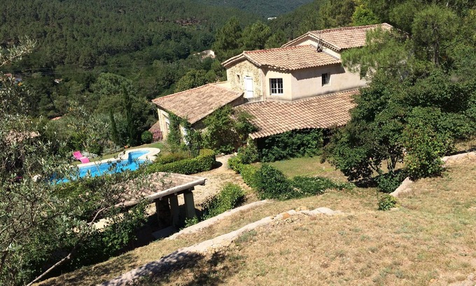 Ground floor: A large covered terrace for gathering around a good meal with direct access to the fully equipped kitchen (oven, hotplates, microwave, large fridge ...) and its annex (freezer, washing dishes, washing machine ...), overlooking a large open room with a dining area, a reading lounge area, a large WIFI lounge area, an office area .... with large windows, one open to the pool and its pool -house, the other offering an exceptional view over the valley.