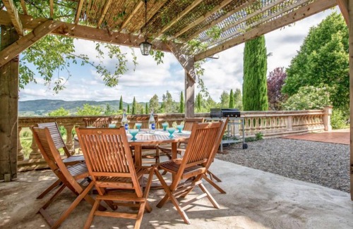 6-room house 300 m2 on 3 levels. Partly renovated in 2025, stylish furnishings: large living/dining room 120 m2 with TV and international TV channels (flat screen), DVD and air conditioning. Exit to the terrace. 1 room with 2 beds. 1 room with 1 french bed (160 cm, length 200 cm), separate WC and shower. 1 room with 1 french bed (140 cm), separate WC and shower. Open kitchen (oven, dishwasher, 4 ceramic glass hob hotplates, microwave, freezer, electric coffee machine, Capsules for coffee machine (dolce gusto) extra) with dining table. Shower/WC. Upper floor: (spiral staircase), 1 room with 1 french bed (160 cm, length 200 cm). 2nd upper floor: (spiral staircase) lounge. Electric heating. Porch 12 m2, south facing position. Terrace furniture, barbecue (portable), deck chairs (8). Marvellous panoramic view of the valley and the countryside. Facilities: washing machine, iron, hair dryer. Garage (2 cars), height 225 cm, width 237 cm. Please note: maximum 1 pet/ dog allowed. Smoke alarm. 3 wall fountains and a skylight in the living room. Alambra mosaics (Arabic type) throughout the house. The rooms located upstairs are in the tower, the living room is accessible via the double bedroom only from where we have a 180 degree view of the surrounding countryside. A plancha (gas) has been installed on the terrace near the kitchen. Please note: Air conditioning is only available in the bedrooms.