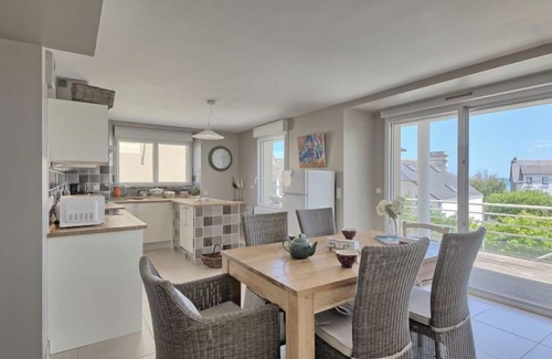 2-family house "Les Embruns". In the district of de la Montagne, à Binic, in an elevated position in the residential district, excellent location: right in the centre but still quiet, in a cul-de-sac. Private: small, well-kept garden 100 m2 (fenced) with wildlife garden and flowers. Garden furniture, parking at the house. Shop, supermarket 600 m, restaurant 1 km, bakery 600 m, bus stop 1 km, sandy beach "Plage de la Banche" 400 m, outdoor swimming pool 900 m. Sports harbour 800 m, sailing school 1 km, tennis 4 km.