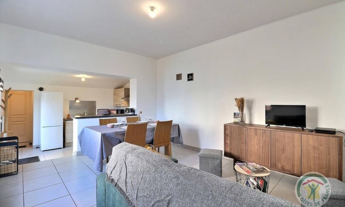 On one level (with a few internal steps): a living room with a kitchen and a living room with lounge, a bedroom with a 160X200 bed, a bedroom with two 90X200 beds, a bathroom and a separate toilet. Easy and free parking on the street and in the garage for a small car. In the city center of Liffré, a pleasant town in the north-east of Rennes, this house offers two comfortable semi-detached rentals ideally located close to services and shops, just 2.7 km from the A84 (Rennes-Caen motorway) and 800 m from the Moulin pond, a place for fishing and relaxation, with a walk on part of the site equipped with picnic tables and fishing pontoons.