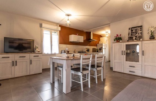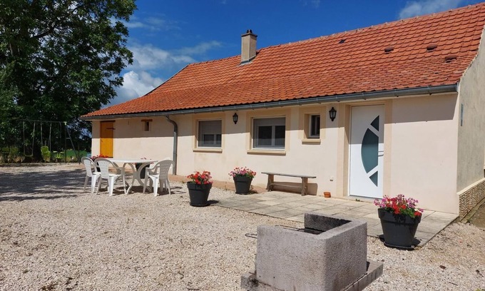 Farmer and dairy farmer in Montbéliarde breed on a small neighboring family farm (visit of the farm possible), Nicolas welcomes you in an authentic charming 19th century country house steeped in history (formerly a press and village café), entirely restored with great care, next to a terroir farm of Bresse chickens in the open (without nuisance, a curiosity for young and old!). At the heart of a peaceful little residential agricultural hamlet, typical and exotic, overlooking a vast wooded plain of meadows, fields and forests, on the edge of a bucolic little river full of fish. Lovely setting and unspoiled rural site, relaxing & restful, nestled in the heart of the Louhannais Bresse countryside, in the hollow of a remarkable natural ecosystem classified as a "Natura 2000 Zone" (exceptional ornithological reserve rich in 160 species of birds and very rare plant varieties ). Comfortable gîte. Warm country cachet of contemporary spirit with Nordic influences. Cozy, zen and soft atmosphere. Outside, you have an exposed & shaded terrace, a large gravel courtyard (real natural pétanque ground!) And a pleasant spacious enclosed garden, landscaped and planted with trees, including a small orchard (plum trees, peach, kiwi, grape, apple trees… / reasoned picking possible) and the owner's vegetable garden (at the bottom of the plot). Beautiful open view over the surrounding countryside. Superb landscape and rural panorama. Composition: Single-storey single-storey house adjoining the owner's house (total independence without vis-à-vis). Wireless. Oil central heating. Kitchen-living room (convertible sofa 2 p. 140x190cm as an extra), 2 bedrooms (bed 2 p. 140x190cm in each), bathroom (shower) separate wc. Private terrace. Courtyard and private enclosed garden (including access to the owner's vegetable garden). Secure closed bicycle room. Shops and services 12 km. TGV station Creusot 64 km.