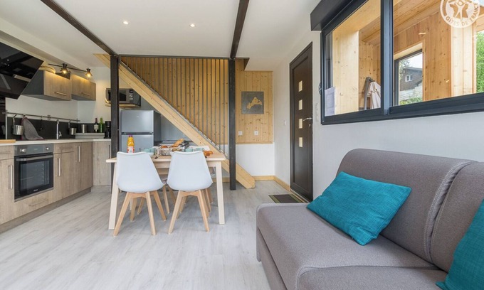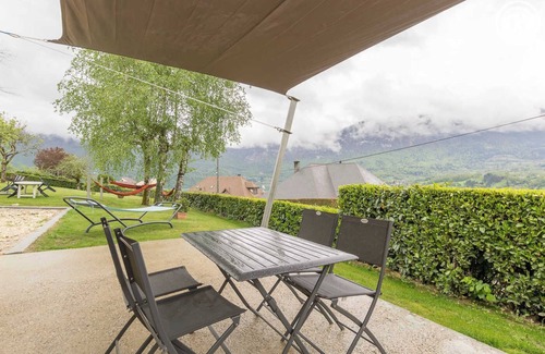 Independent chalet on 2 levels. Ground floor: open living room-kitchen lounge area (1 sofa bed 140 x 190 cm), bathroom (shower and separate toilet) with laundry area (washing machine). On the 1st floor: 1 bedroom (1 double bed 160x200 cm) and a mezzanine (1 double bed 140x200 cm). Terrace with outdoor shower, large enclosed and landscaped grounds with hammocks. Private parking. It is a small modern cocoon located on a beautiful outdoor property that awaits you. Perfectly suited for holidays with friends or family, on the lookout for lake and mountain activities offered by a region famous for the beauty of its site and the purity of its waters.