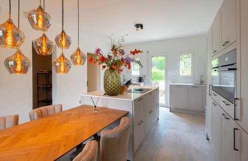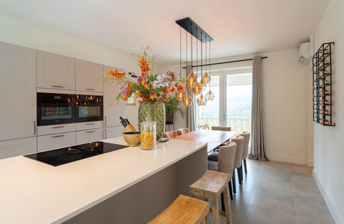 The fully equipped modern kitchen has a wonderful breakfast corner and large dining table. From the kitchen you walk onto the large covered outdoor dining and lounge area overlooking the pool and garden. It's the perfect setting out of the sun to have wonderful lunches and dinners while contemplating the beautiful views!