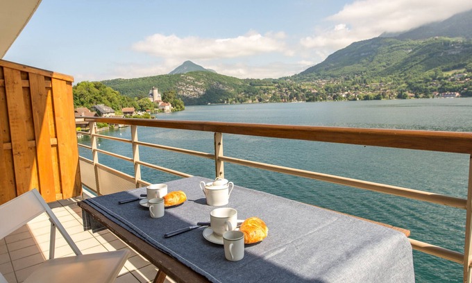 This wonderful and spacious apartment is situated on the 3rd floor of an 4 star residence, offers an amazing view on the Lake Annecy and the mountains. Private access via the residence to the lake.