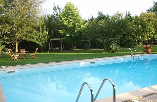 Tour en Bessin 6 km from Bayeux: This old farmhouse was used during the Second World War for the Resistance and was renovated into a holiday home comfortable, historical single-family house "Les Londes", surrounded by trees and fields. Outside the resort, 7 km from the centre of Bayaux, in a quiet position, 8 km from the sea, in the countryside. Private: large, well-kept garden 1 ha (fenced) with lawn and flowers, meadow, courtyard, swimming pool (11 x 5 m, depth 100 - 215 cm, seasonal availability: 28.May. - 30.Sep.) with alarm system. Children's playground (swing). In the house: table tennis, billiard table, playroom, table football, central heating system. Parking on the premises. Shop 6 km, grocery 6 km, supermarket 6 km, restaurant 6 km, bar 6 km, bakery 6 km, bus stop "Maison" 6.3 km, sandy beach "Omaha Beach" 17 km. Golf course (36 hole) 13 km, tennis 6 km, riding stable 10 km. Nearby attractions: Arromanches 17 km, Omaha Beach 17 km, Plages du débarquement, Caen, Bayeux aventure (Cussy) 2 km. Please note: car recommended. Suitable for families, baby equipment on request (included). Object suitable for 10 adults + 2 children. Fishing [permit required], on request. Animals in the neighbourhood. (Pool can be heated on request, extra on availability). Numerous farm animals can be discovered in surrounding area.