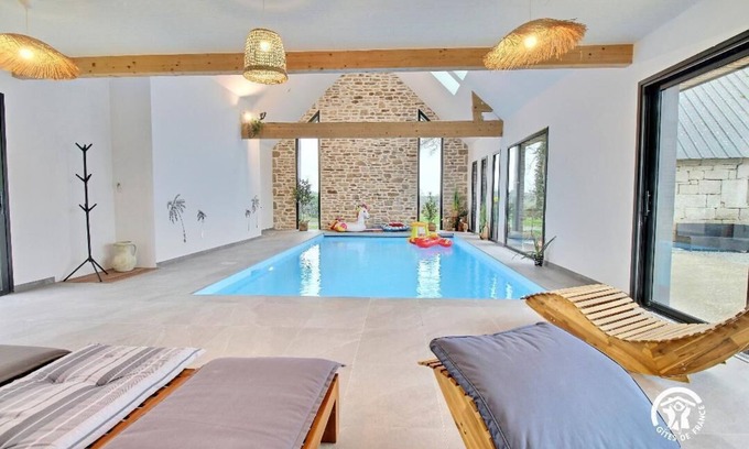 House spread over three levels: Ground floor: - Living room with kitchen opening onto the living room - Laundry room - Separate toilet with washbasin. First floor: - Master suite with a queen-size bed (160x200cm), private shower room and toilet - Master suite with a king-size bed (180x200cm), private shower room and toilet. Second floor: - Bedroom with a queen-size bed - Dormitory with four single beds (90x200cm) - Bathroom - Separate toilet. Outdoors: Small garden and terrace with garden furniture and barbecue. Shared with a second gîte (Ref. 56G17335 - Sleeps 10) Petanque court Parking with several parking spaces Heated indoor swimming pool (Dimensions: 4 x 7m / Depth: 1.30m) The pool is open from 9am to 9:30pm from June to September and from 9am to 8pm the rest of the year. Other information: Accommodation adjoining the owners' house. Discover the "Le Cottage" gîte, a charming, carefully renovated stone house offering a welcoming setting, ideal for a vacation with family or friends. Outside, a furnished terrace invites you to enjoy sunny days with a meal or a relaxing moment. The pétanque court promises moments of sharing and good humor for young and old alike. For a wellness break in any season, the heated indoor pool is a real asset, accessible in all weathers. Located in Pluméliau, in the heart of the Blavet Valley, the accommodation benefits from a preserved natural environment. There are numerous hiking, biking, and horseback riding trails, particularly along the towpath. Nearby, don't miss the village of Saint-Nicolas-des-Eaux and its enchanting setting. The La Balade du Père Nicolas leisure park, just 1 km away, will delight the whole family.