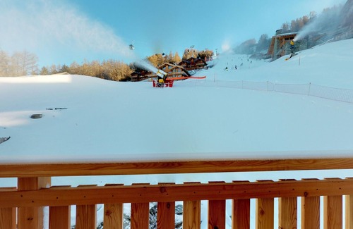- Outside: Balcony with outdoor table and chairs and view of the piste