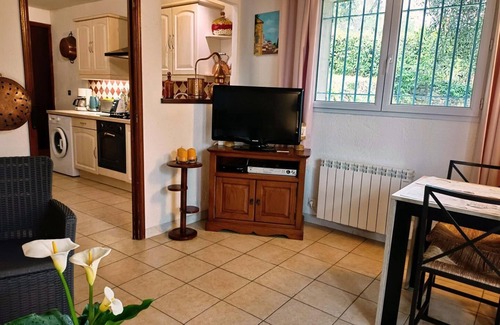 Independent entrance via terrace (a few steps) onto - Living room dining area. Open fitted kitchen. - Bedroom with 1 double bed (140x190 cm) - Bedroom with 2 single beds (90x190 cm). - Bathroom with toilet. Common enclosed plank land (several levels) covering an area of 2,500 m². Parking on the property. Electric heating. Charges included. On request with extra : cleaning fee, bed linen and bathroom linen Independent gîte on the ground floor of the villa of the owners' house. Chateauneuf de Grasse is an ideal place to explore the Mediterranean and the Riviera hinterland. Near Grasse, capital of perfumes, leisure and services on the Riviera coast (Cannes, Antibes, Nice...), Gourdon, a hilltop village classified as "Most beautiful villages in France" overlooking the Grasse countryside and the Azur pre-Alps .