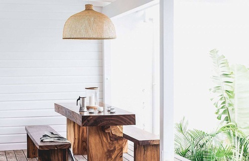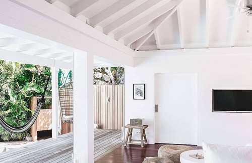 Although it is not directly on the beach, Villa Les Palmiers is in many ways the quintessential beach house. Relaxed, modern, and organic in style, the luxury rental property evokes that same serenity, effortlessness, and warmth of a day by the seashore. The materials are natural, textured, and sumptuous, such as the ipe wood decks outside, the luxuriously soft linens on the beds, and even the beautifully marbled wood of the cutting boards in the kitchen. There may not be sand underfoot, but there is a large swimming pool and a private outdoor shower, island breezes waft through, and you can see stunning ocean views and hear the waves crashing from every room.