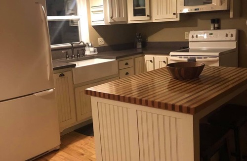 The kitchen was nicely renovated. You will find full size appliances, a farm sink and all the tools needed to cook your own meals. Get togheter around the big island with a glass of wine or a hot coco after a day on the slope!
