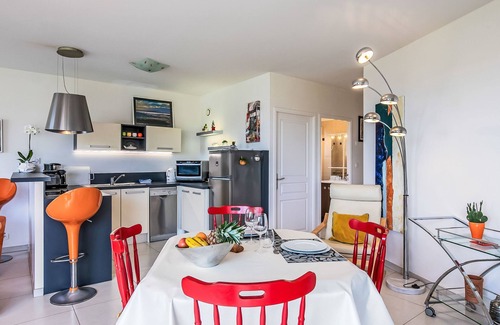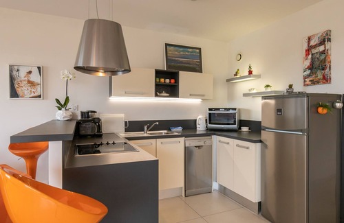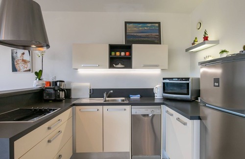 "Les Pieds dans l'eau", 2-room apartment 58 m2, on the ground floor. Spacious and bright, very comfortable and tasteful furnishings: large living room 42 m2 with TV and flat screen. Exit to the garden, to the terrace. 1 room with 1 double bed (2 x 90 cm, length 200 cm). Open kitchen (dishwasher, 4 ceramic glass hob hotplates, toaster, kettle, freezer, electric coffee machine, Capsules for coffee machine (Tassimo) extra, combination microwave) with bar. Shower, sep. WC. Electric heating. Terrace furniture, deck chairs (2). Marvellous view of the sea. Facilities: washing machine, dryer, iron, hair dryer. Internet (WiFi, free). Please note: non-smokers only. Smoke alarm. Offer by a private individual according to Art. 155, IV of CGI. 29030000056XK