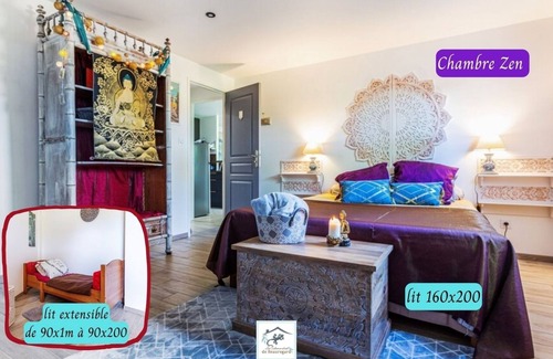 - Bedroom 2 (Buddhist Zen): a queen-size bed (160×200) and a single extendable bed (90×200).