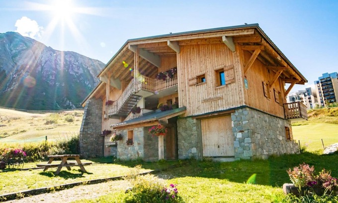 Chalet with 6 cottages + accommodation owner. 1st floor: Studio (4 beds 1 p. / 2 bunk + trundle 2), Wifi, bathroom (bathtub). Balcony. Common ground + parking in summer only. Skiing Tignes/Espace Killy at 200 m. Cross-country skiing at 100 m. Golf on the spot. Swimming pool at 500 m. Basic boating & water at 100 m. Contemporary Chalet style at 200 m from the slopes of the vast Espace Killy ski area. At the heart of the famous "olimpiyskiy" on the edge of the golf and the waterbody. Residential quiet. Nice South expo. Small landscaped. All services & shops on-site. Beautiful views of mountain.