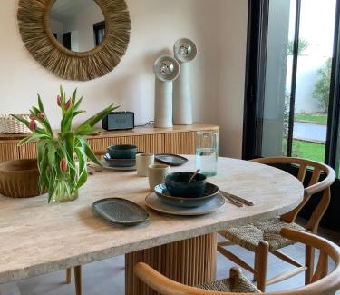 Offering garden views, Les Villas du Bois in Le Bois-Plage-en-Ré offers accommodations and a garden. This property offers a private pool, free Wifi, and free private parking. The rooms include a patio with views of the pool. The villa complex will provide guests with air-conditioned units offering a wardrobe, a coffee machine, a dishwasher, an oven, a safety deposit box, a flat-screen TV, a terrace, and a private bathroom with a walk-in shower. There's also a dining area and a fully equipped kitchen with a microwave, a toaster, and a fridge. At the villa complex, the units include bed linen and towels. A bicycle rental service is available at the villa. Plage des gollandieres is a 15-minute walk from Les Villas du Bois, while La Rochelle Train Station is 15 miles from the property. La Rochelle - Île de Ré Airport is 11 miles away.
