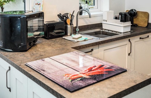 The kitchen is well equipped: Induction hob, oven, dishwasher, microwave, toaster, kettle and Dolce Gusto drinks machine (with enough pods to get you started. Sainsburys sells pods). There is a washing machine, ironing board and iron and cleaning equipment in the pantry.