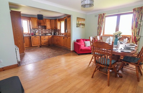 Levally House has a king-size with en-suite walk-in shower, basin and WC, a double with en-suite walk-in shower, basin and WC, a ground-floor double with en-suite walk-in shower, basin and WC and a double serviced by a ground-floor bathroom with bath, basin and WC. There’s a kitchen/diner equipped with an electric double oven and hob, microwave, air fryer, fridge, dishwasher, kettle, toaster and Smart TV. And a utility with a washing machine, tumbler dryer and chest freezer. There’s a sitting room with an open fire and Smart TV. WiFi, fuel and power, bed linen and towels are included in the rent. Travel cot available. 2 x stairgates. Outside there’s ample off-road parking, an enclosed gravelled patio with seating and a front garden with lawn. Sorry, no pets and smoking. Enjoy an Irish getaway with a stay at Levally House. Note: Check-in from 3pm, check-out by 11am. Note: Good Housekeeping Bond 450GBP. Note: There's a step up to the entrance.