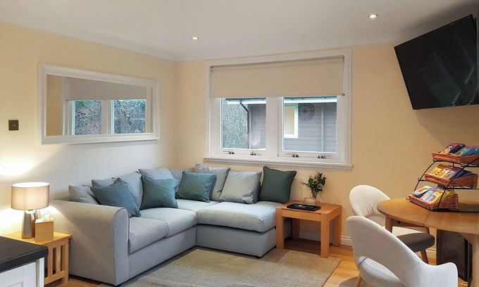 Shower Room: Walk-In Shower, Heated Towel Rail, Toilet. Gas central heating, electricity, bed linen, towels and Wi-Fi included. Hot tub for 2 (private). Private parking for 1 car. No smoking.. Welcome to the epitome of holiday indulgence on the shores of Loch Lomond, situated in the Loch Lomond Castle Estate. This charming cosy chalet, which forms Loch Lomond Sanctuary Lodges, is a gem nestled within the Lomond Castle Estate and promises an unforgettable escape for discerning families and groups in search of a retreat from the hustle and bustle of everyday life. A row of four lodges, one bedroom lodge, three two-bedroom lodges and the Kingfisher sleeping six guests. Book all four lodges great for groups of friends or family get-togethers.
