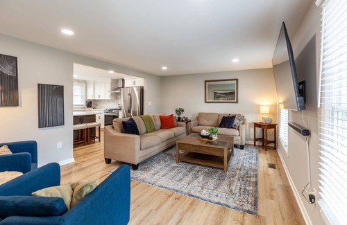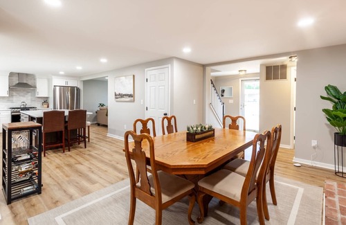 Families will love that there are multiple hangout spaces throughout the home. Spread out in the main floor great room with the gourmet kitchen overlooking the large flatscreen TV in the living room. The USNA graduate owner has refinished the kitchen with the gourmet chef in mind! Enjoy entertaining your guests while they sit around the kitchen island with seating for 6. Curate a large family meal and spend time around the dining room table with seating for 6 more. Walk out onto the furnished screened-in porch overlooking the quiet private fenced-in backyard.