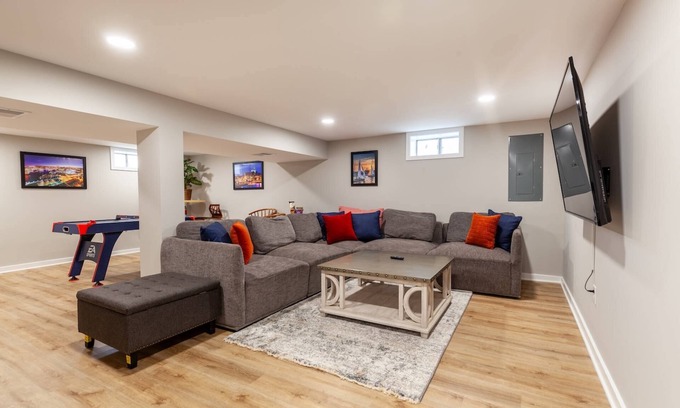 The lower-level features both a full recreation room as well as a private workout room with an exercise bike and weights. Watch football on the sectional sofa around the large TV or challenge each other to a game of air hockey or foosball.