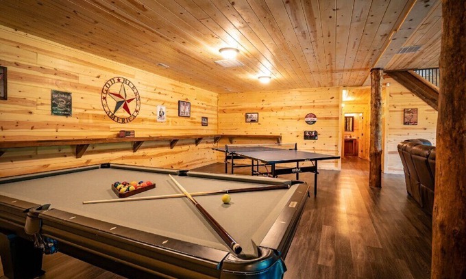 You won't ever want to leave this 8 bedroom lodge once you give it a try! The main floor features an open design with breakfast bar, ample seating, stone fireplace and HDTV for your enjoyment. Downstairs you will find a pool table as well as ping pong for the competitor in you as well as additional seating and another stone fireplace with HDTV. The 2 bunk lofts offer additional sleeping with bunk beds, 32” HDTVs, smart blu-ray players and private half baths. Approximately 10 acres this property is a mixture of pasture and trees just .3 miles from Cantwell Cliffs. This property can be combined with nearby lodges to accommodate even larger groups if needed.
