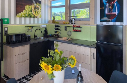 This 2-bedroom, 1-bathroom rental features a living room, a dining area, and air conditioning. Bathroom amenities include a hair dryer, towels, and toilet paper. The kitchen is equipped with a stovetop, a refrigerator, and a dishwasher, as well as a coffee maker, an electric kettle, and a microwave.