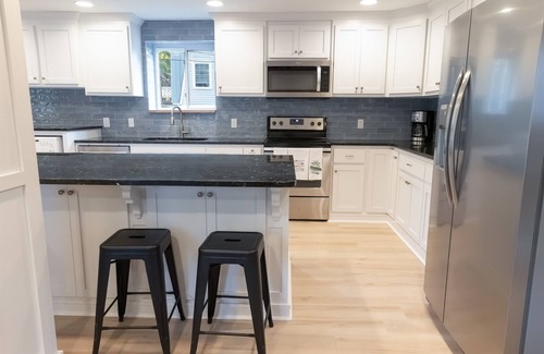 MAIN KITCHEN: Stove/oven, refrigerator with ice maker, microwave, dishwasher, dishware/flatware, cooking basics, Coffee maker with coffee and extras, toaster, breakfast bar, blender, crock pot, spices, countertop mixer.