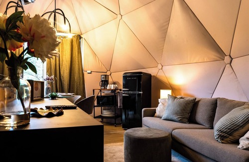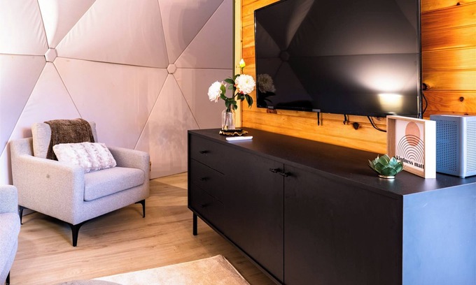 1 Queen Sized Bed, 1 Full Sized Bed in the Loft, 1 Small Size Refrigerator, Sleeps 3 to 4. Our geodesic domes are equipped with kitchens, bathrooms, hot tubs, cozy beds. This dome sleeps 4 people and has its own incredible view.