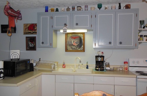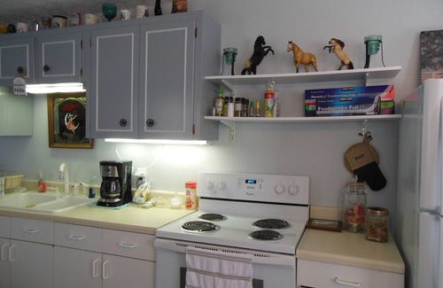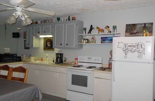 Your guest house has a full kitchen with standard size refrigerator and stove. Stocked with lots of bake ware, dinnerware, silverware and basic spices and condiments. Feel free to bring your groceries and make yourself at home.