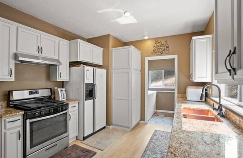 Nature's Paradise. Unobstructed views of CDA Lake, right off the 300sq ft deck. It has a Large Kitchen and open floor plan. At night you can warm up by the fireplace. There is also a fire pit to roast marshmellows and enjoy a bottle of wine. Watch a bald Eagle catch a fish. You can bike for days on the CDA trail that is a stones throw away. Fantastic city marina that you can moor your boat free, for 48 hours. 5 min walk to town where there is lots to explore. general store, shops, 3 restuarants, ice cream shop, public beach and a park. RV Parking avaliable on the property.