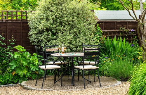 Gravel parking area with fenced off stream, bistro set for four and patio area