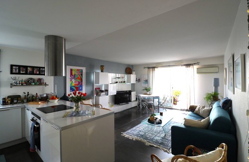 This lovely and personally decorated apartment is located in a gated area on the hills of Nice. Here it is calm and pleasant and the air is fresh. In the fenced area, there is a fan-shaped pool, 22 meters, which is shared with the other residents.